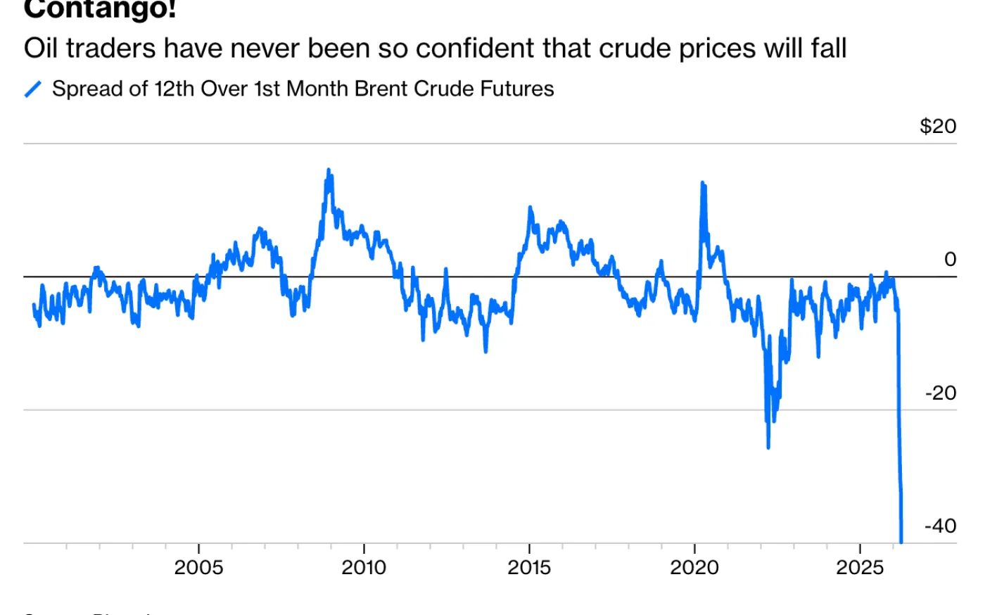 Crude oil futures are in the deepest contango ever recorded — front month priced well below 12 month out.