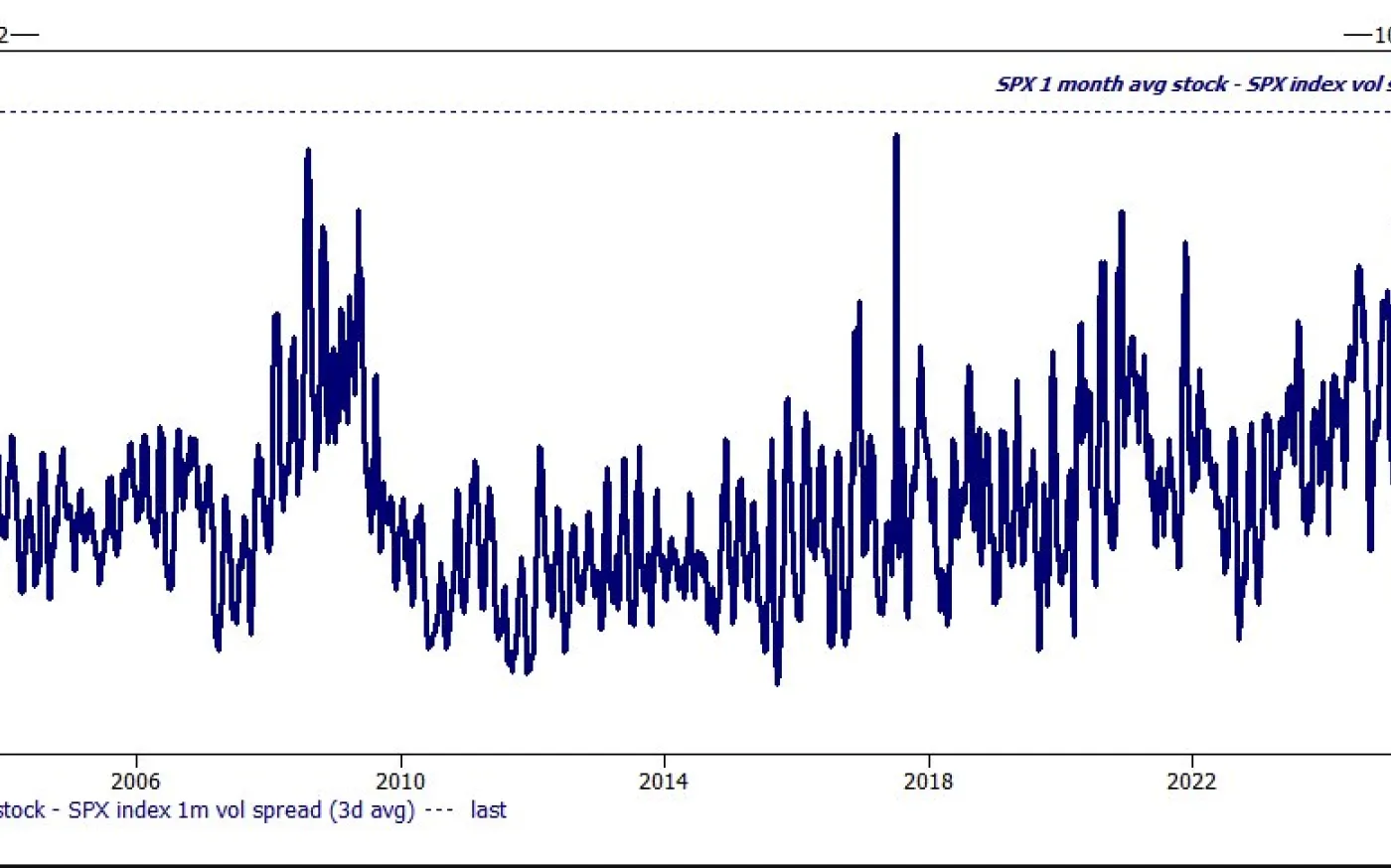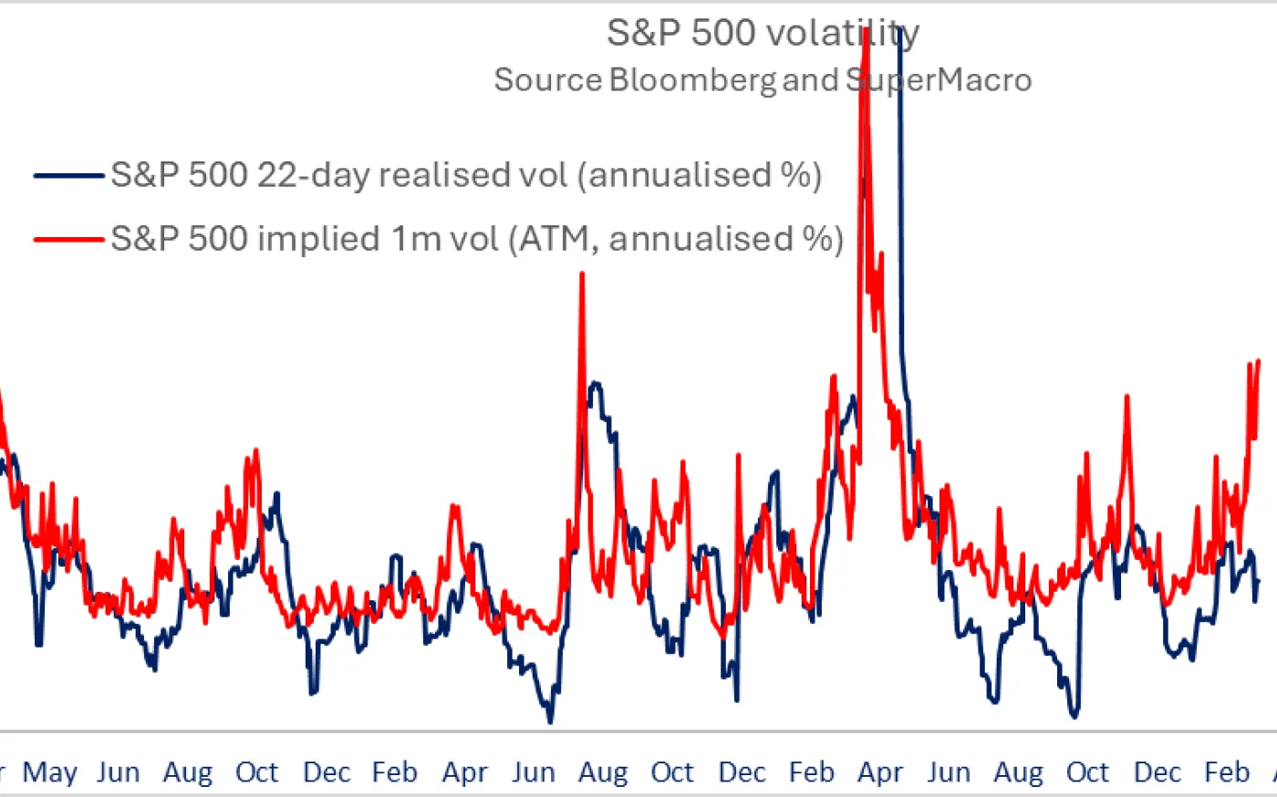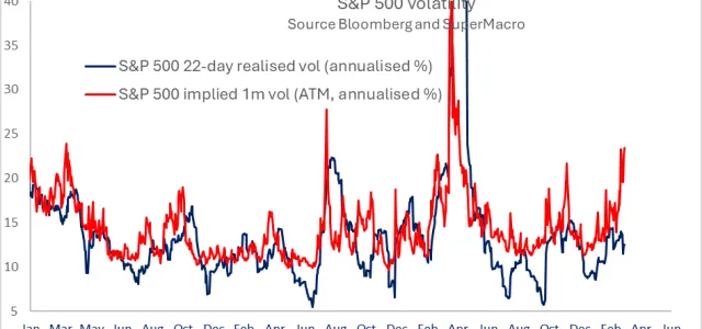 S&P 500 implied vol (VIX at 27) needs 2% daily moves to justify — but 10-day realized vol is floating around 10–11. The spread between