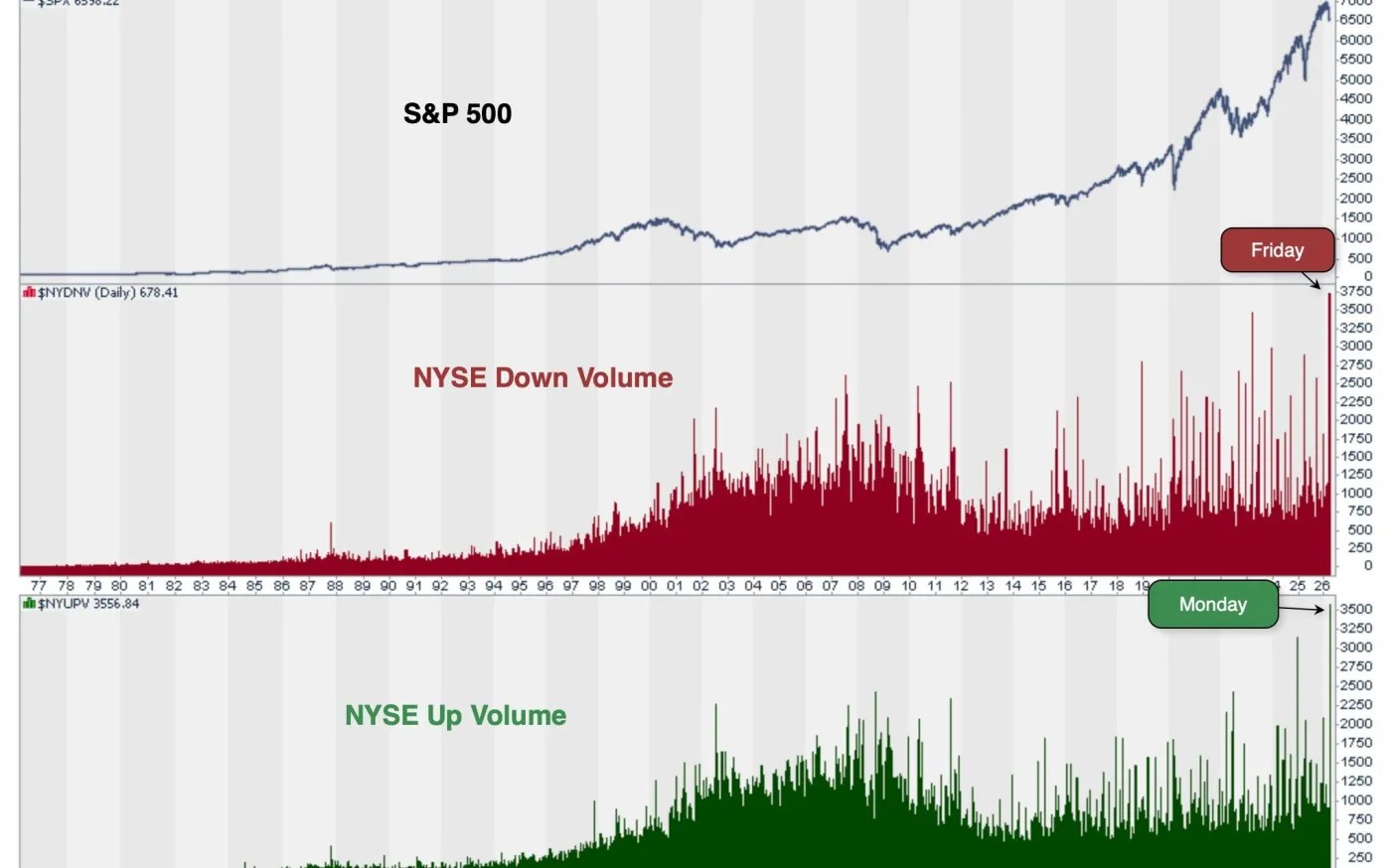The NYSE recorded its heaviest down volume ever on Monday, followed by its heaviest up volume ever on Tuesday — two historic extremes