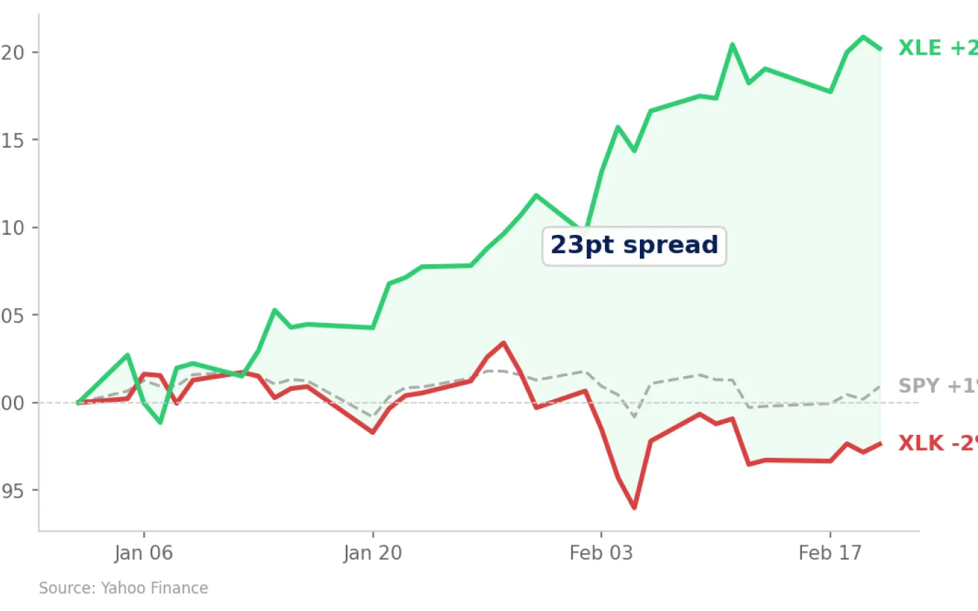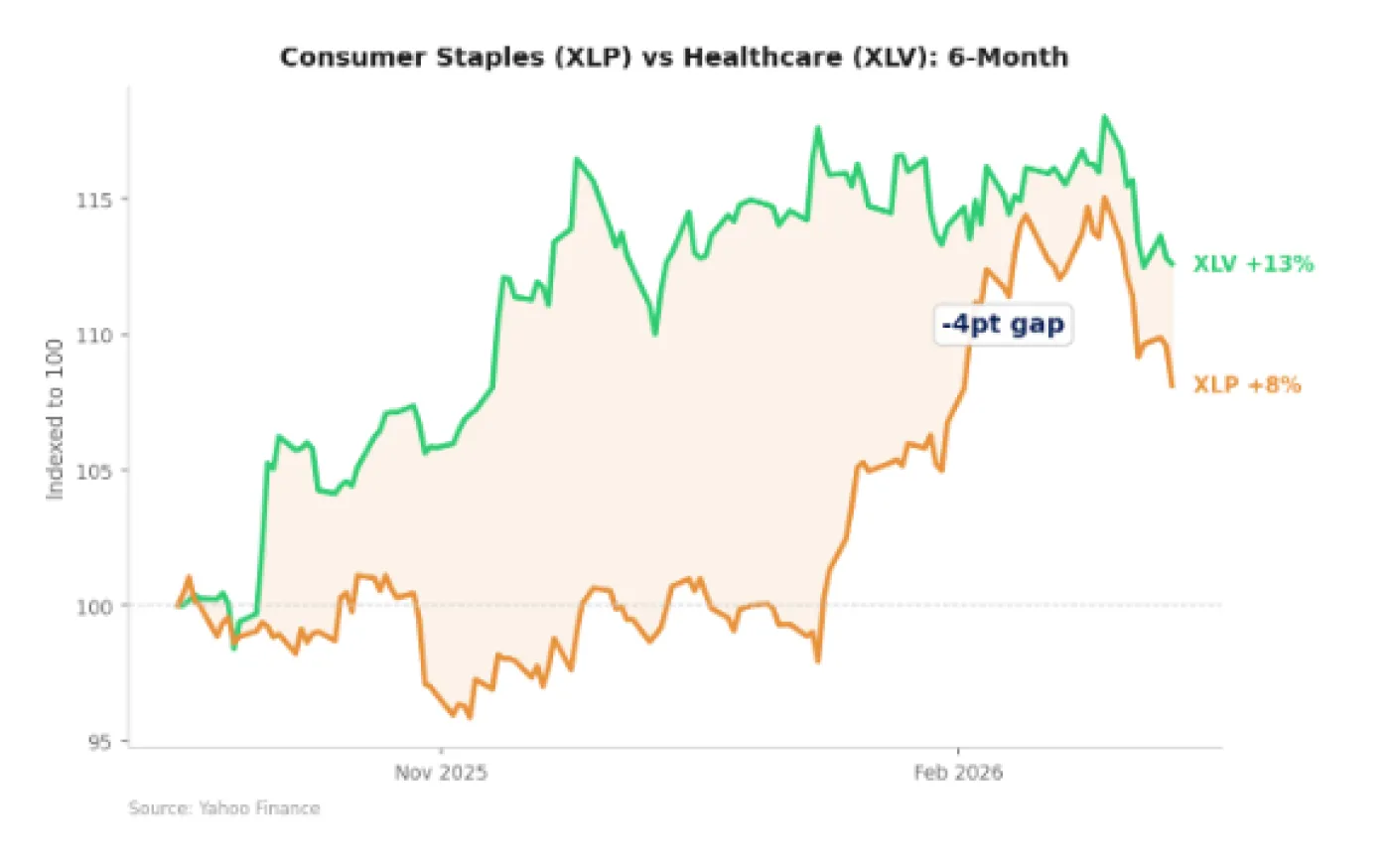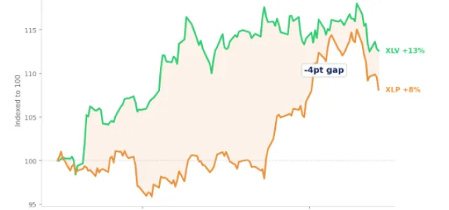 The defensive rotation may have missed a sector. Staples are up 10% this year as investors reach for safety. Healthcare — equally non-cyclical, equally essential |