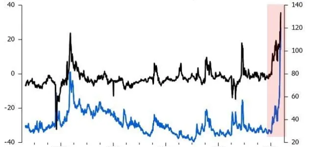 WTI implied volatility surged to the highest since 2020, and second-month call skews are the most bullish in data going back to