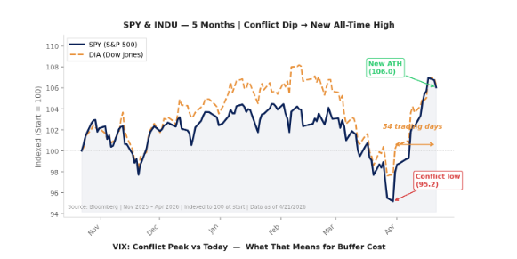 The S&P went from -9% to a new all-time high in just 54 trading days — one of the fastest reversals since 1950. The conflict pushed rates up. The resolution brought vol down. VIX dropped from 31 on March 27 to 19.5 today — a 37% move in less than four weeks.
