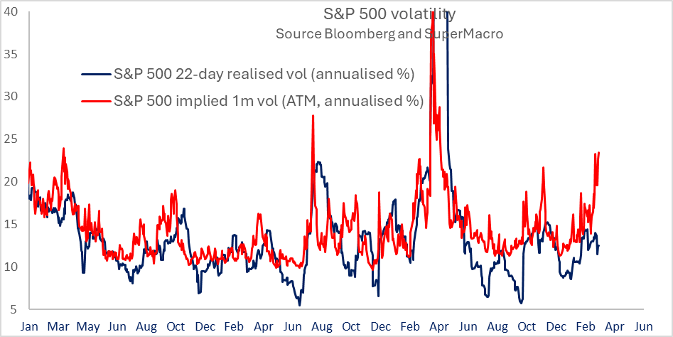 S&P 500 implied vol (VIX at 27) needs 2% daily moves to justify — but 10-day realized vol is floating around 10–11. The spread between implied and realized is one of the widest on record, meaning the market is pricing in chaos but not actually delivering it
